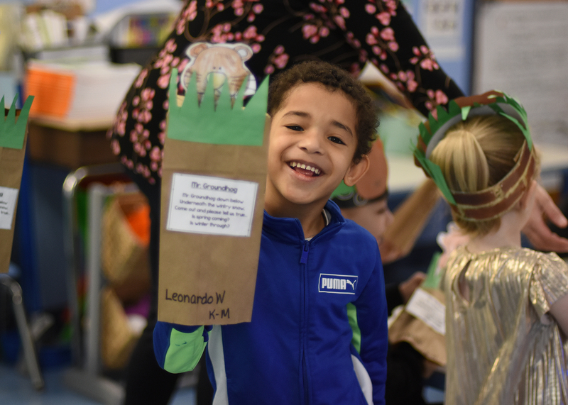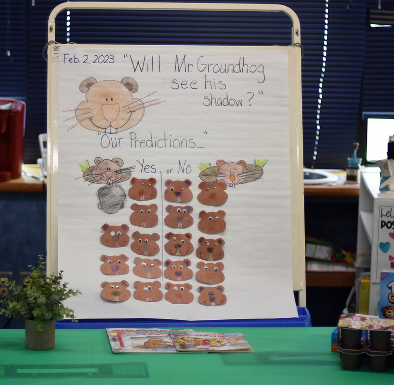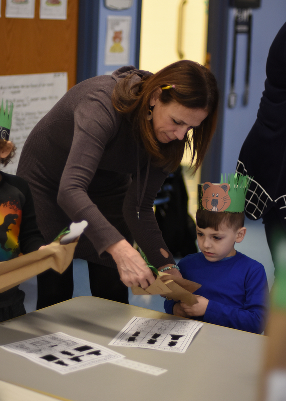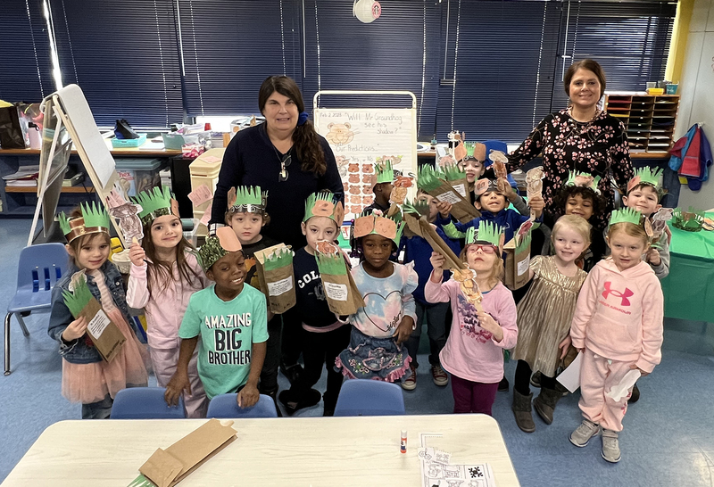 In Mrs. Muttillo’s Kindergarten classroom at Bellamy, students have been working super hard to prepare for their Groundhog’s Day classroom celebration! “We started our groundhog studies by learning some basic facts about groundhogs, including their basic dietary needs and about their habitats,” said Muttillo. The students have also been learning about animals that hibernate for the winter. They made a prediction chart and learned that predictions are guesses that people make about different things. The kiddos are using our prediction chart to discuss numbers in math, including greater than and less than. They are also learning beginning adding and subtraction. “We learned the /sh/ digraph in ELA, created shadow puppets for dramatic play and began a discussion about shadows and what is needed to create a shadow. We practiced creating shadows today using a spotlight from our science kit, a darker classroom, our groundhog puppets and ourselves of course,” said Muttillo. They completed shadow worksheets, wore special crowns that we made, enjoyed a special snack and will celebrate with a parade to end our festivities later today!