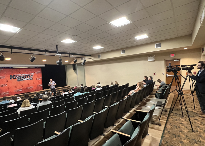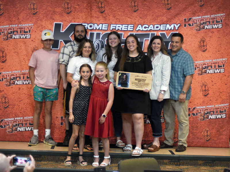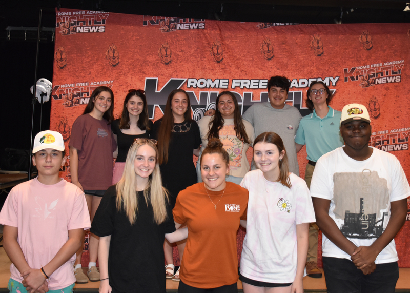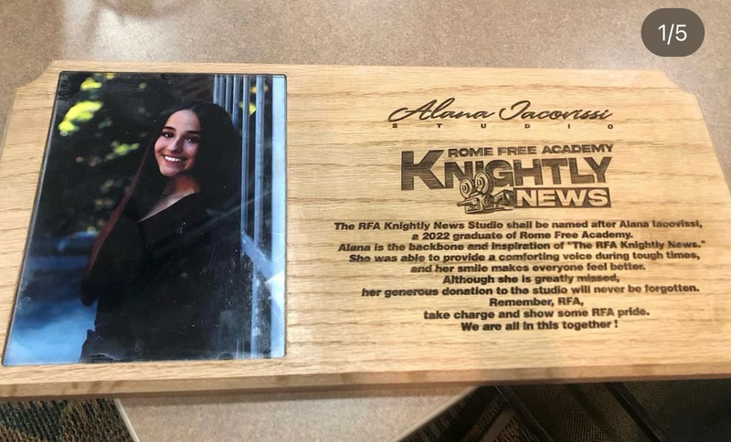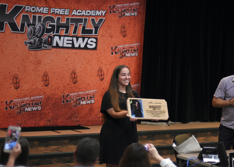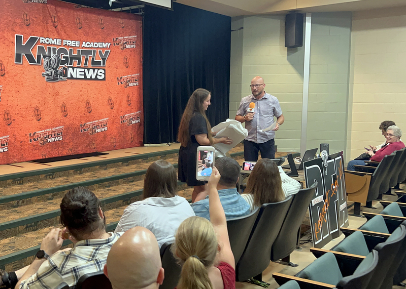 In addition to her achievements as a news anchor, Alana Iacovissi contributed significantly to the RCSD Board of Education as a student member during the 2021-22 term. She served as the President of STASS (Student Association of the School) and was a valued National Honor Society and Leo Club member. Furthermore, Iacovissi generously donated $1,000, which is granted to each departing Board member to support meaningful endeavors. Carl Manganaro, FTE in Rome/Technology Integration Specialist for MORIC, produces the RFA Knightly News. He said the donation was utilized to purchase various items. These include a professional backdrop, a wireless microphone set, a cam link for streaming purposes, and a plaque.