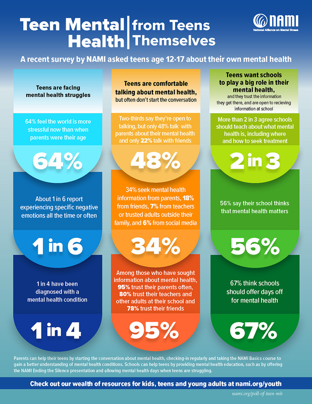 A new National Alliance on Mental Illness (NAMI) Teen Poll, conducted by Ipsos found that teens who are struggling with their mental health are looking to their schools and parents for information and support.