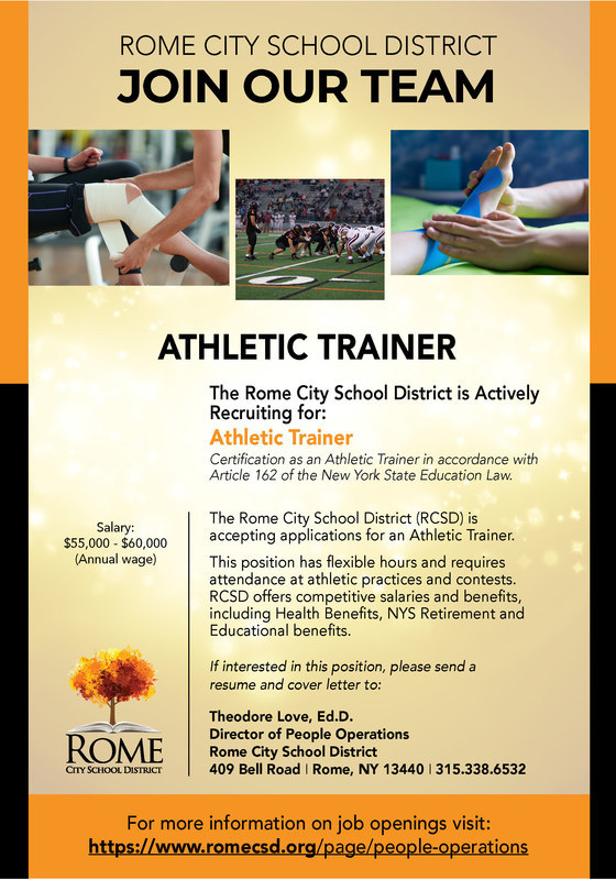The Rome City School District (RCSD) is accepting applications for an Athletic Trainer. This position has flexible hours and requires attendance at athletic practices and contests. RCSD offers competitive salaries and benefits, including Health Benefits, NYS retirement, and Educational benefits.