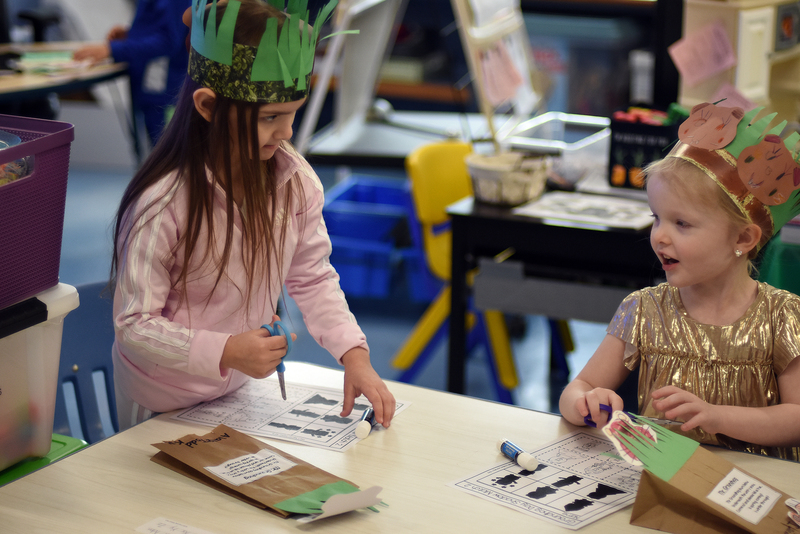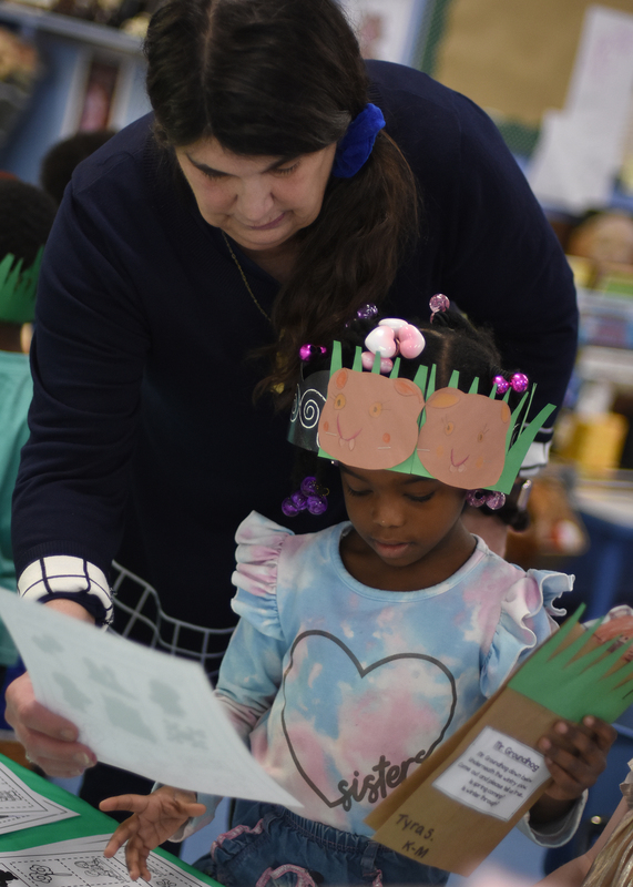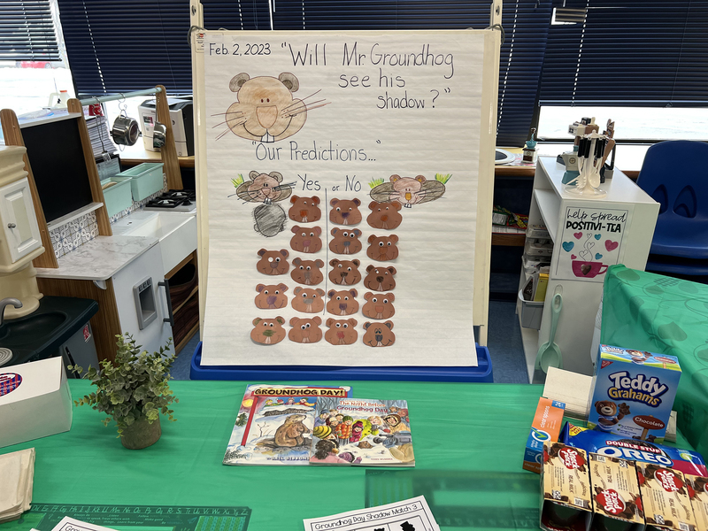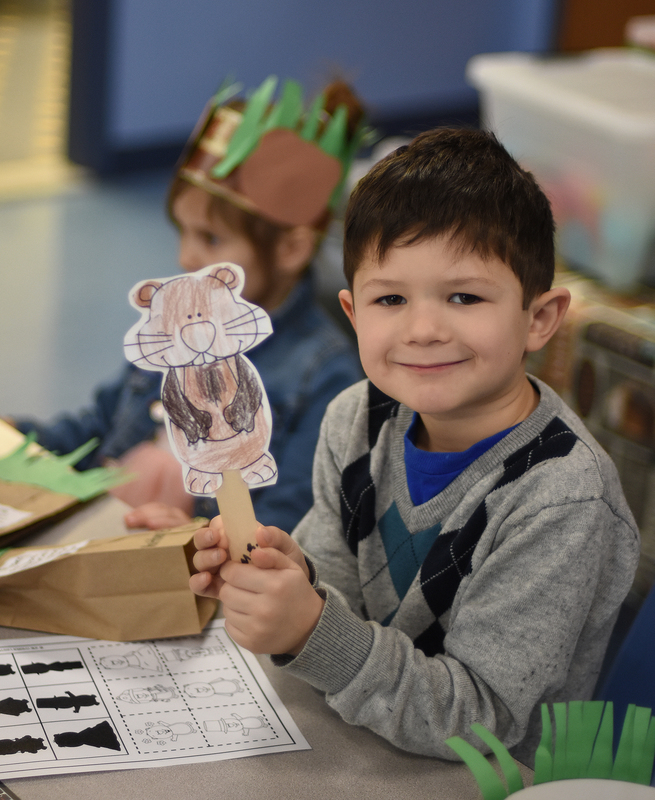 In Mrs. Muttillo’s Kindergarten classroom at Bellamy, students have been working super hard to prepare for their Groundhog’s Day classroom celebration! “We started our groundhog studies by learning some basic facts about groundhogs, including their basic dietary needs and about their habitats,” said Muttillo. The students have also been learning about animals that hibernate for the winter. They made a prediction chart and learned that predictions are guesses that people make about different things. The kiddos are using our prediction chart to discuss numbers in math, including greater than and less than. They are also learning beginning adding and subtraction. “We learned the /sh/ digraph in ELA, created shadow puppets for dramatic play and began a discussion about shadows and what is needed to create a shadow. We practiced creating shadows today using a spotlight from our science kit, a darker classroom, our groundhog puppets and ourselves of course,” said Muttillo. They completed shadow worksheets, wore special crowns that we made, enjoyed a special snack and will celebrate with a parade to end our festivities later today!